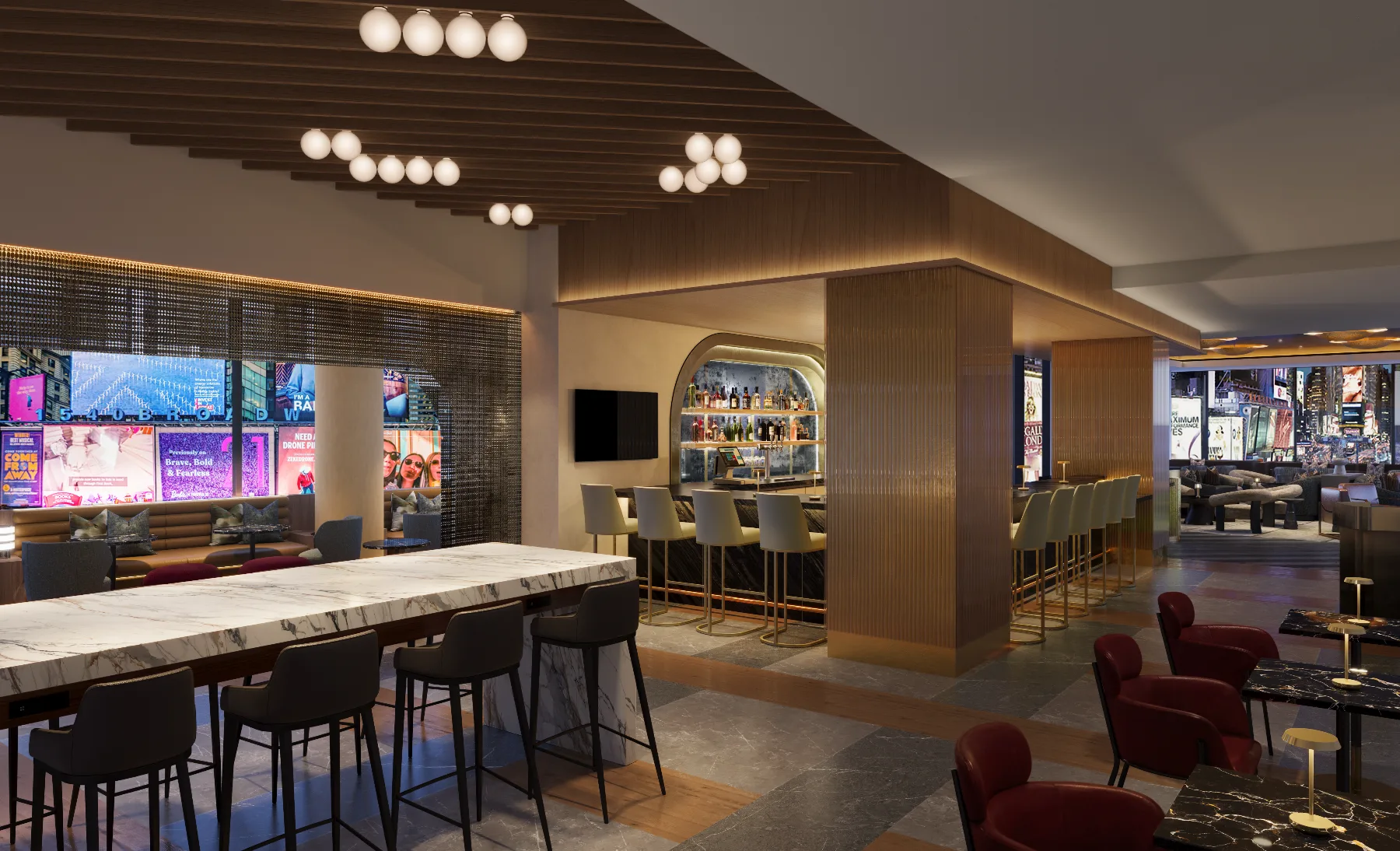 Bowtie Bar occupies the Renaissance Hotel Times Square's prime real estate at 714 Seventh Avenue where floor-to-ceiling wraparound windows deliver the most coveted ball drop views in Manhattan, you're suspended above seven million street revelers watching through unobstructed glass. The brand-new cocktail lounge (opened November 2025) channels Art Deco theater glamour with polished metals, jewel-toned fabrics, and Italian marble, all illuminated by Times Square's electric billboards. For New Year's Eve 2026, this is where the city's most discerning celebrate warm, elevated, with champagne in hand and the ball descending at eye level.