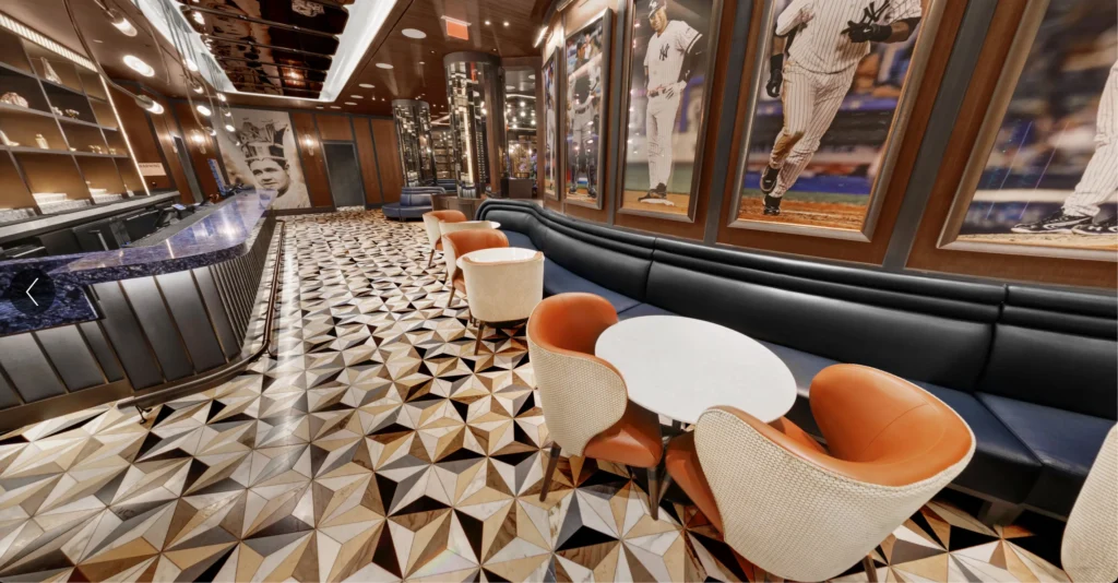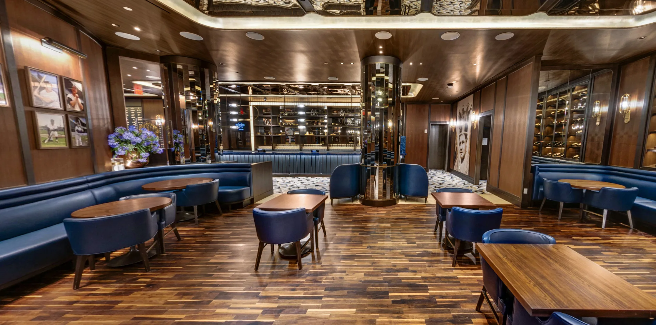 NYY Lounge (also called NYY Events) is a 1,800-square-foot private event space on the ground floor of Hard Rock Hotel Times Square. It's a partnership between Hard Rock International and the New York Yankees, featuring Mozambique wood-paneled walls, blue leather banquettes, autographs from 86 legendary Yankee players, and an antique bronze mirrored ceiling. The space normally operates as an upscale steakhouse and private dining venue.