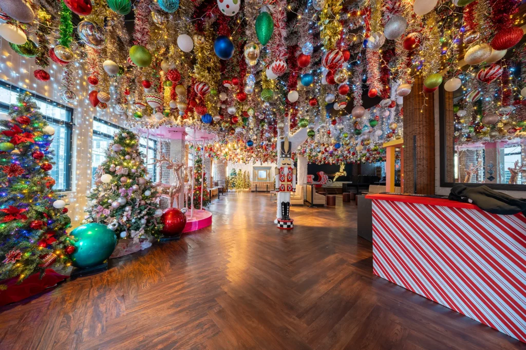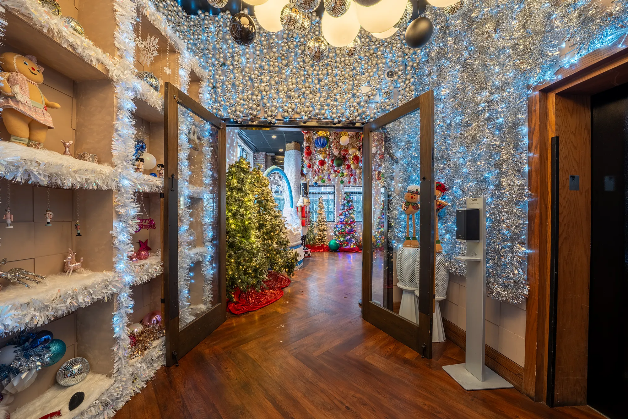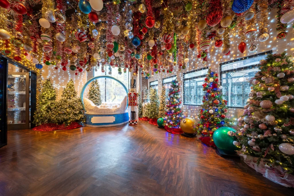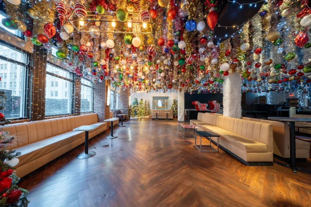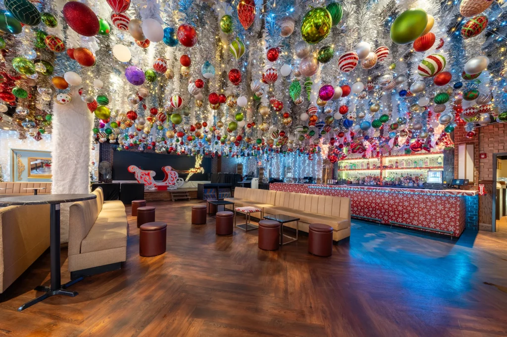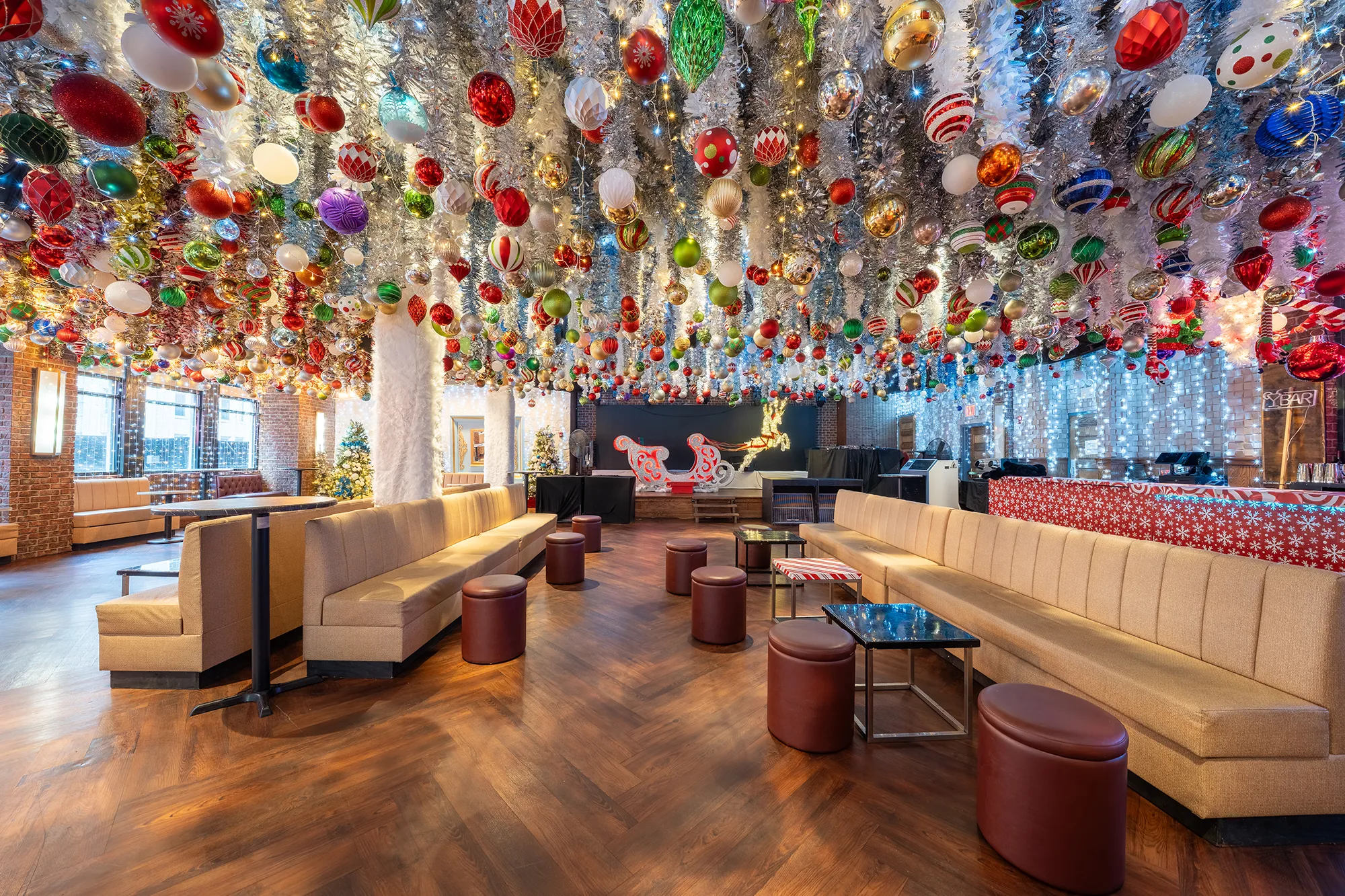New Year's Eve at Palma Verde transforms the VIP lounge into North Pole Santa's Workshop with six hours of celebration from 8 PM to 2 AM. Premium open bar flows for four hours (9 PM-1 AM) while complimentary appetizers circulate beneath that ornament-covered ceiling. A DJ spins across herringbone floors as you move between candy cane-striped bars and lounge seating. At midnight, champagne toast in hand for those 21+, join the countdown surrounded by thousands of hanging ornaments in this one-night holiday transformation.