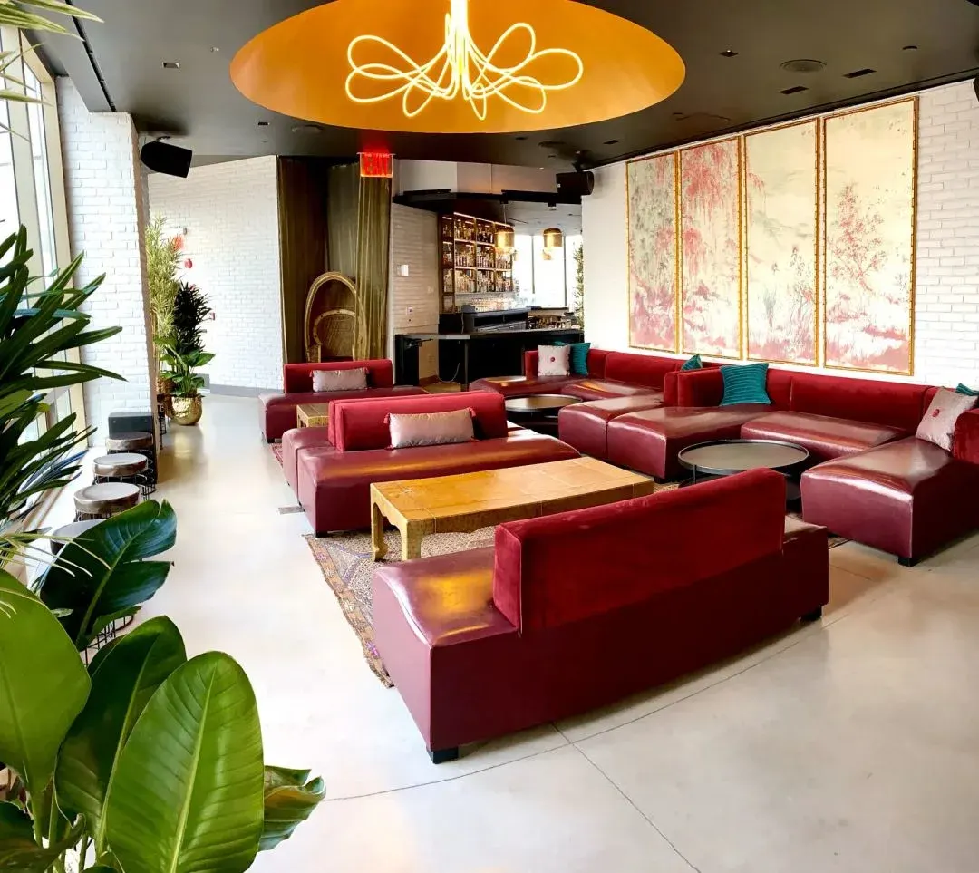 The Crown Rooftop sits 21 stories above Chinatown at 50 Bowery, delivering 360-degree skyline views that stretch from the Freedom Tower to the Empire State Building to the Brooklyn Bridge. The space divides between a sleek indoor lounge featuring floor-to-ceiling windows, burgundy leather sectionals, gold accents, Asian-inspired decorative panels, and a striking neon-lit ceiling dome—plus two open-air terraces with modern seating and glass railings for unobstructed city panoramas. This is downtown rooftop elegance without the Midtown crowds, where the views alone justify the trip.